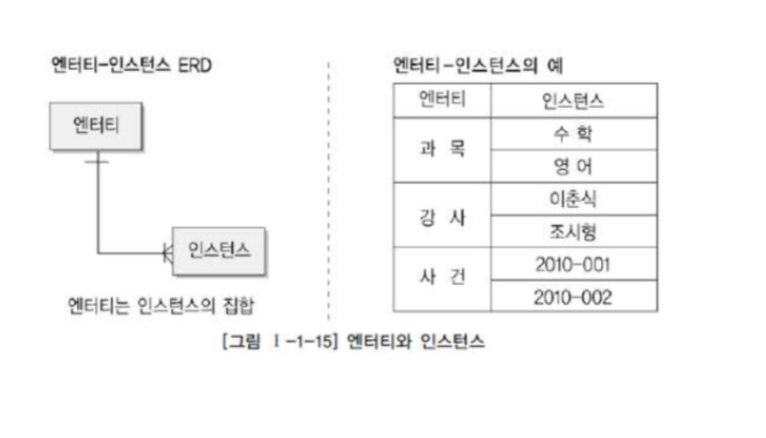 - 엔터티 - 인스턴스 : 한 개의 엔터티는 2개 이상의 인스턴스 집합이어야 한다.